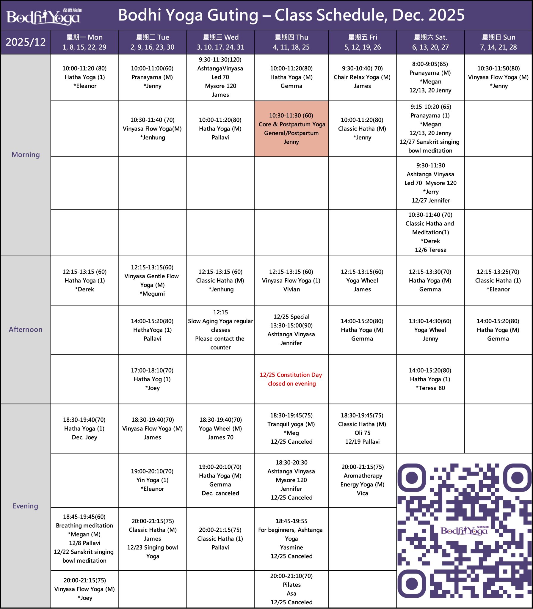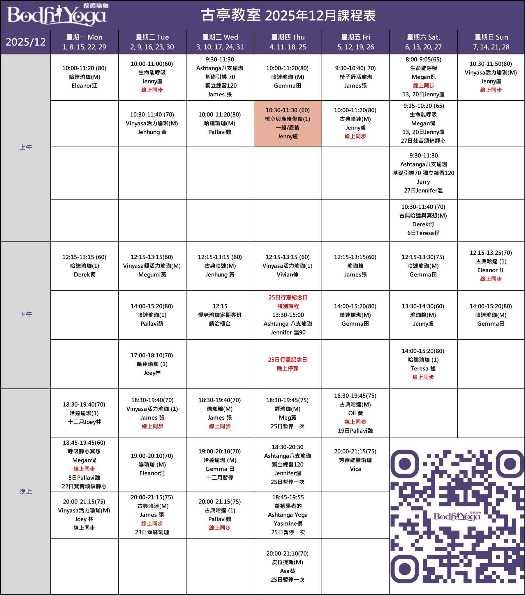 葆體瑜珈古亭教室課表 2025年12月課程 English class schedule