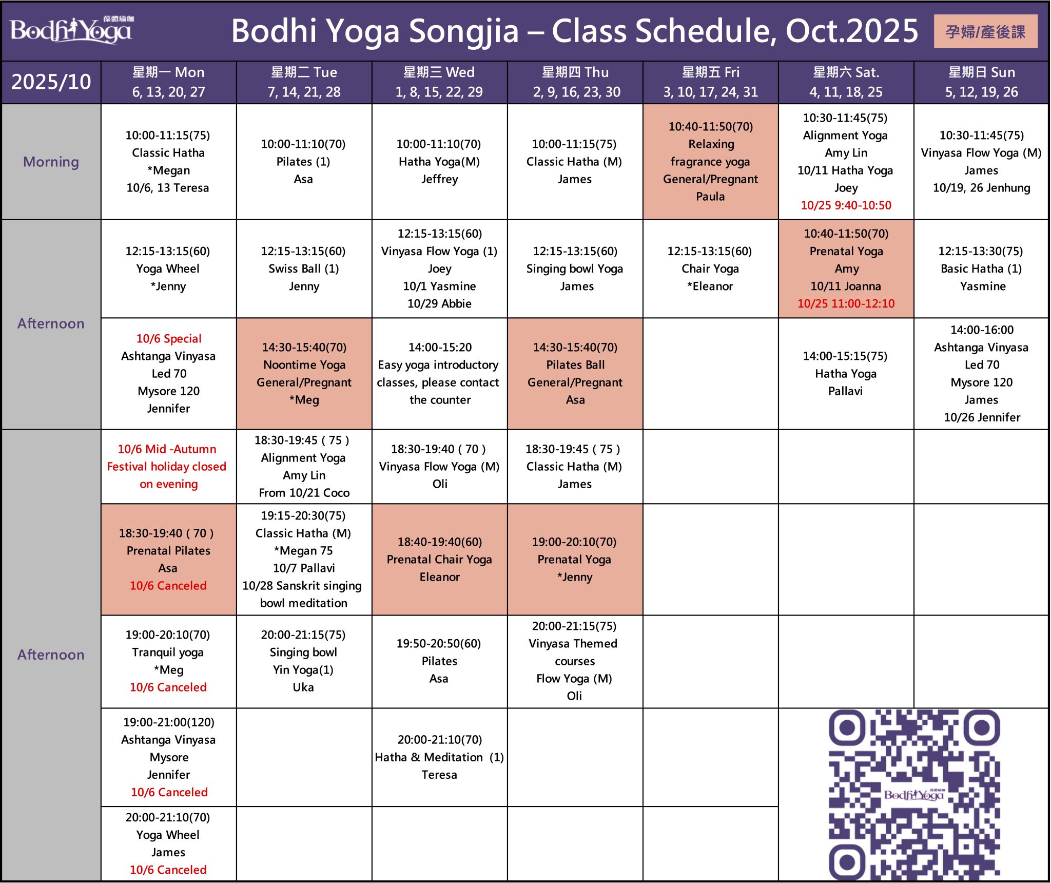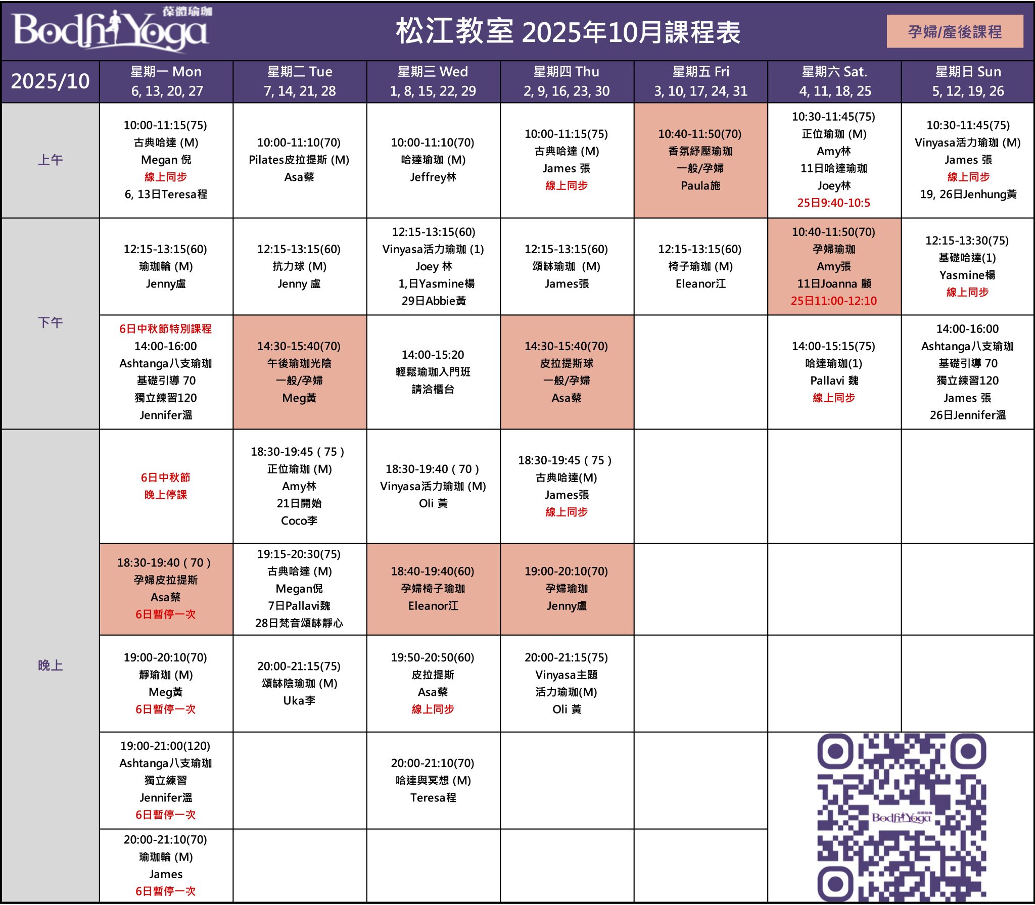 葆體瑜珈松江教室課表 2025年10月含孕婦課程 English class schedule